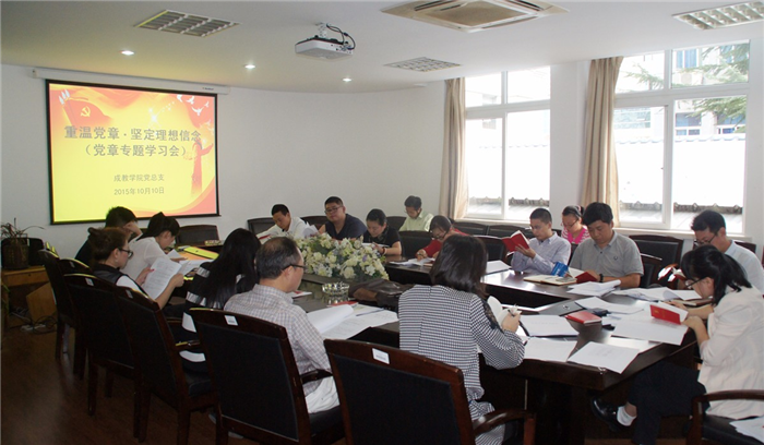 10月10日下午,成教学院党总支开展以“重温党章、坚定理想信念”为主题的学习党章专题教育活动。学习教育活动由党总支副书记张煜主持,党总支委员、全体党员参加。