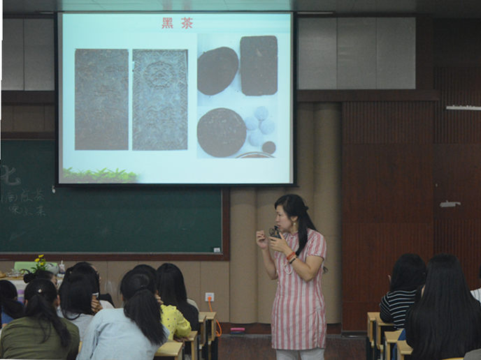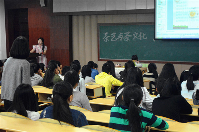 讲座由“82年龙井”的民间故事开始,故事将现场同学带入茶的世界,让同学们明白茶文化与中国传统文化之间紧密的联系。陈老师从中国茶简史、中国茶分类、饮茶与健康、科学饮茶等四个方面进行讲述。在讲座过程中,陈老师爱女亲自为同学们表演茶艺并沏茶。讲座间同学们与老师积极互动,气氛热烈。