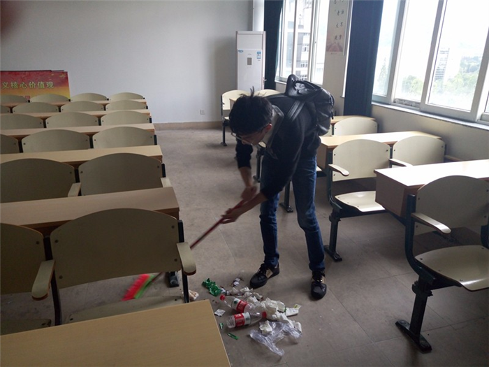 据悉,此次活动于下午一点半正式开始。每组的负责人召集各位组员,领取扫把、铲子、桌布等工具到达好学楼地点教室,开始了清理工作。大家分工合作有条不紊,认真对桌子里的小广告进行清理并打扫教室,虽然,需要清理的教室多、天气寒冷,但大家并没有抱怨,都积极的投入到清理的工作中。经过两个小时努力,教室变得更加清洁。