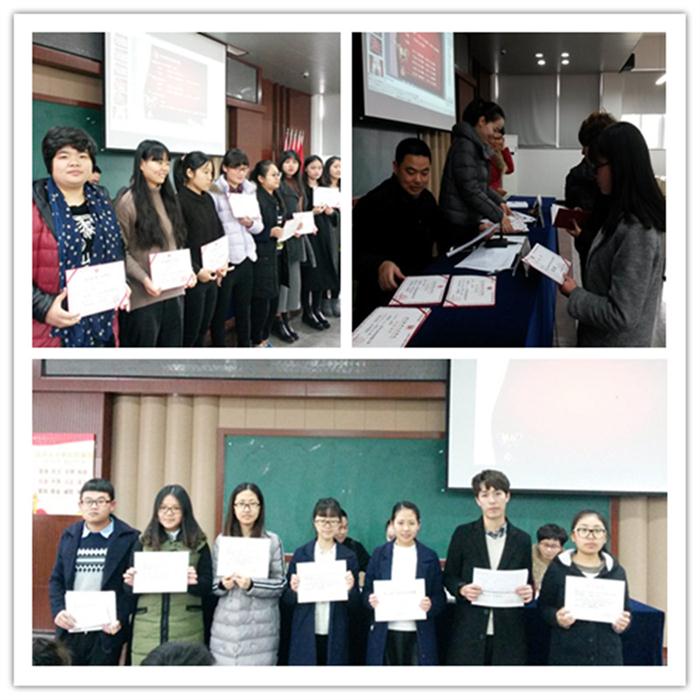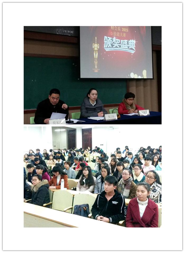 1月13日下午,财会系2015年职业技能大赛颁奖典礼在崇学楼101举行,系党总支副书记吴冰、系副主任简家进、金融教研室主任王赛芝、实训科长徐宁蔓及相关老师、获奖学生和2015级新生班级代表出席了会议。会议由系党总支副书记吴冰主持。