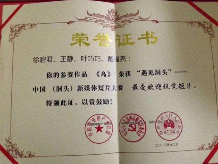 10月1日至12月31日,中共温州市洞头区委、温州市洞头区人民政府联合中国艺术家协会、中国微电影产业联盟举行了"遇见洞头"——中国(洞头)新媒体短片大赛。我院信息技术系代表队的作品《岛》在比赛中脱颖而出,获得“最受欢迎视觉短片”奖。该代表队由信息技术系学生徐碧君、王静、戴福亮、叶巧巧组成,他们在该系徐婧、高和蓓老师的悉心指导下历时三个月完成了该作品。