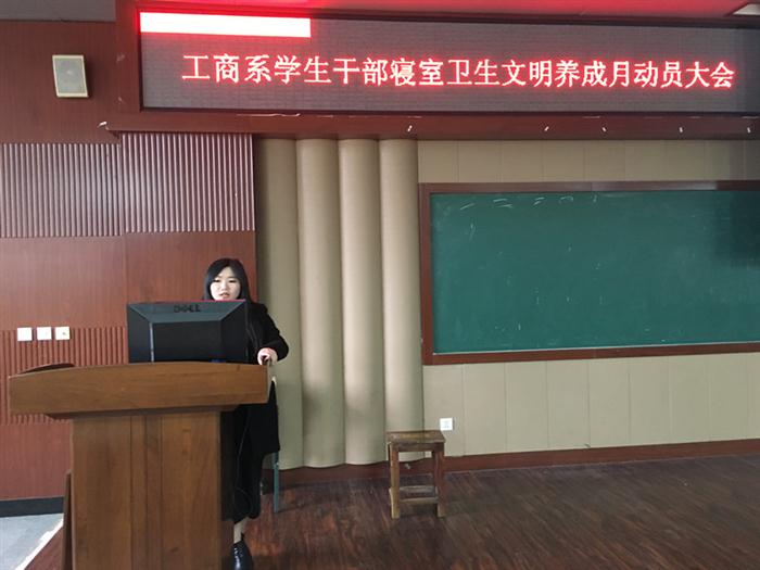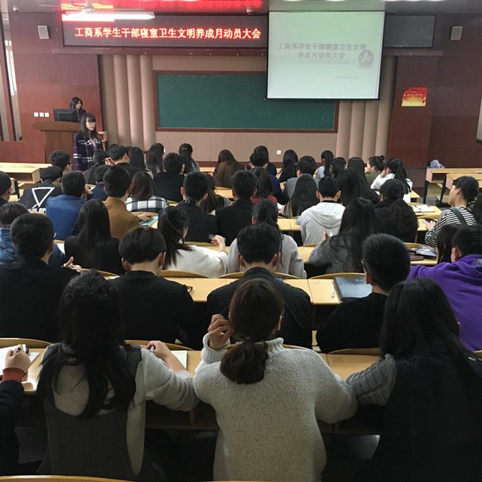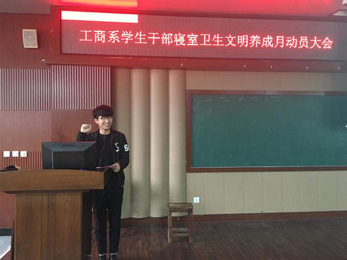 为切实加强学生公寓管理工作,把学生寝室卫生文明工作落到实处。3月8日中午12:30,工商系在善学楼101举办学生干部寝室卫生文明养成月动员大会。学工办林景老师、陈宙老师以及全体学生干部参加了大会。