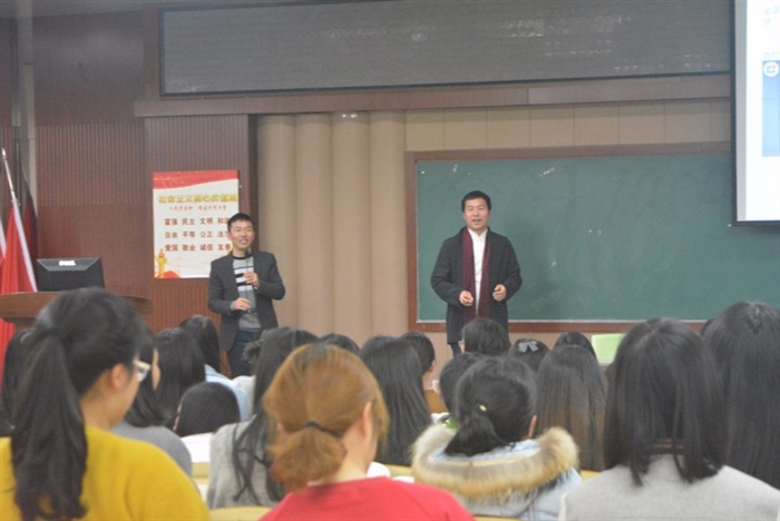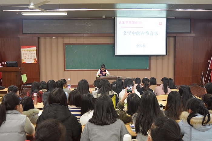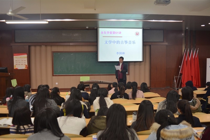 为了让同学们了解中国传统文化,品味流传千年的美妙弦音,财会系传统文化进学堂讲座于3月21日下午17:00在崇学楼101举行,这是女生学堂的重要组成部分。本次讲座的主题是“文学中的古筝音乐”,主讲人是李国和老师,近百名学生聆听了讲座。