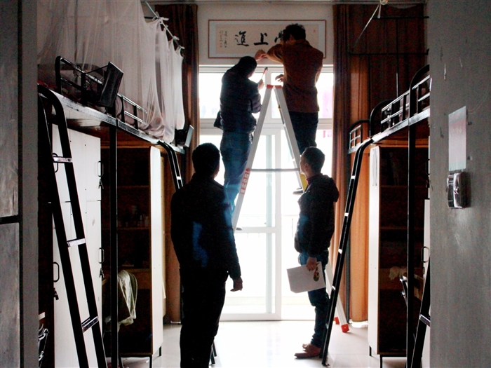3月22日 早上10点,由辅导员林文龙老师带领生活部同学,开始带工人到各楼层、各寝室装订书法作品,历经一个上午,每个寝室都安装完毕,看着充满学习氛围的寝室,大家再累的辛苦都值得了。