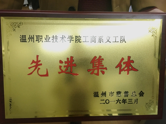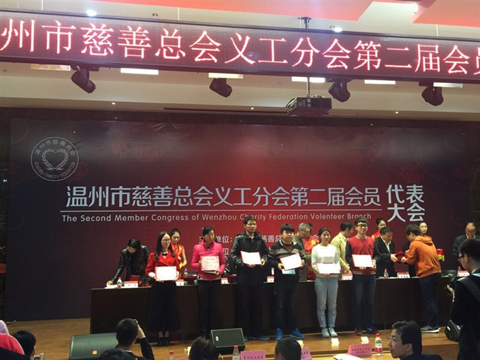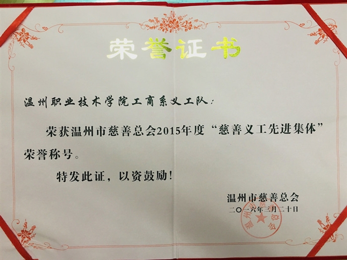 在刚刚结束的温州市慈善总会义工分会第二届会员代表大会中,温州职业技术学院工商系义工队荣获温州市慈善总会2015年度“慈善义工先进集体”称号。同时,工商系国际商务1401班任颀豪、国际商务1503班金秋霞两位同学获得温州市慈善总会2015年“优秀慈善义工”称号。