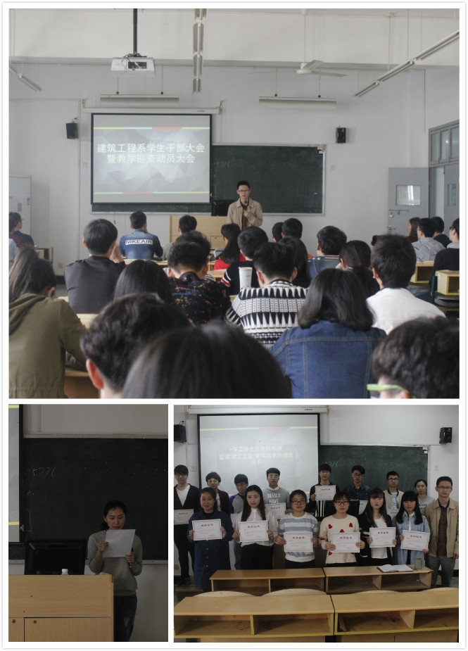 在会议中,启动了2016年建筑文化节活动。学生自律委员会介绍了寝室文化节相关事宜及阶段性成果,学生干部代表发出倡议,希望同学们以实际行动投入到“文明课堂”和“文明寝室”的创建中去。学工办主任余爽老师宣读了2016年3月份建工之星获奖名单,系党总支书记苏跃飞老师颁发证书。