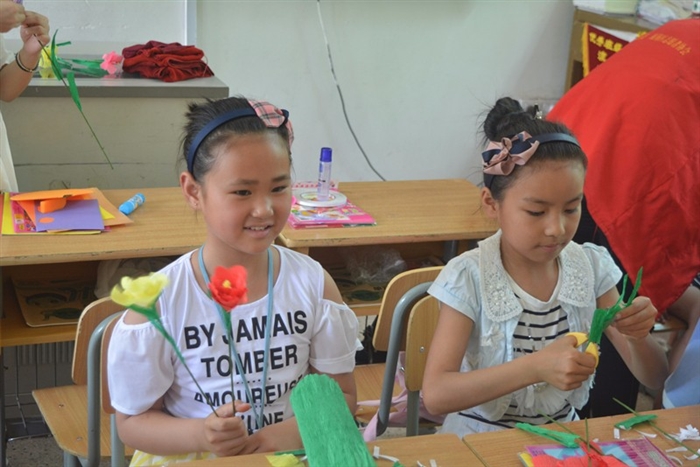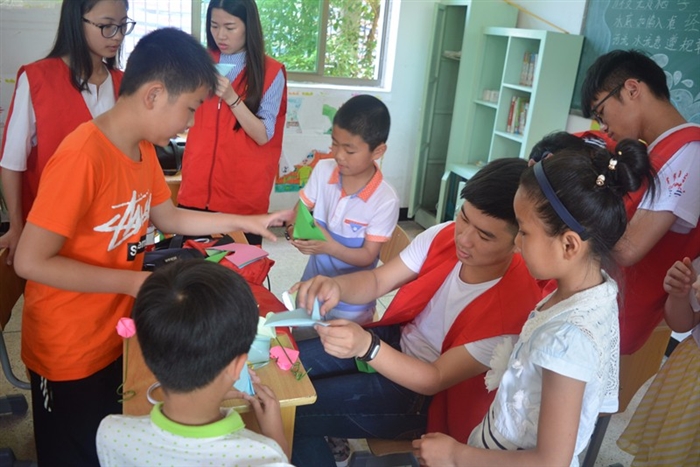 埔坪辅导学校地处大山深处,孩子们对知识充满着无限向往。欢乐课堂上,志愿者手把手教授他们制作剪纸、折纸、手工花的技巧。在志愿者们的指导之下,孩子们专门给老师、家人、同学制作了作品,表达了对他们的关心和感激。