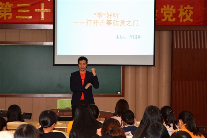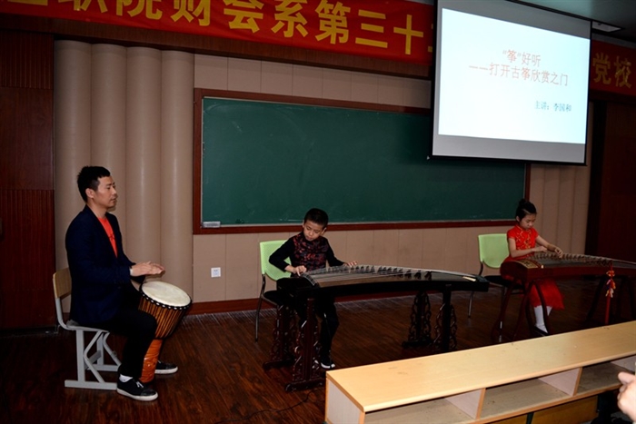 (财会系通讯员 程红波)为了传播中华传统优秀文化,增强学生的文化自觉意识,财会系女生学堂特邀浙派古筝传承人、温州市民族管弦乐学会会员李国和老师为同学们讲授中国古筝的历史和文化,150余名学生参会聆听。