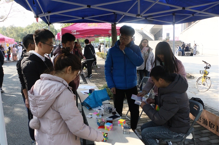 在互动游戏环节, 24点计算、你画我猜、正话反说、箭投壶、王者挑战赛、吹乒乓球、还原魔方等24个游戏引得参与同学流连忘返。每一个都是一项挑战,挑战成功可获得一枚印章,集齐15枚即可去社联抽取大奖。