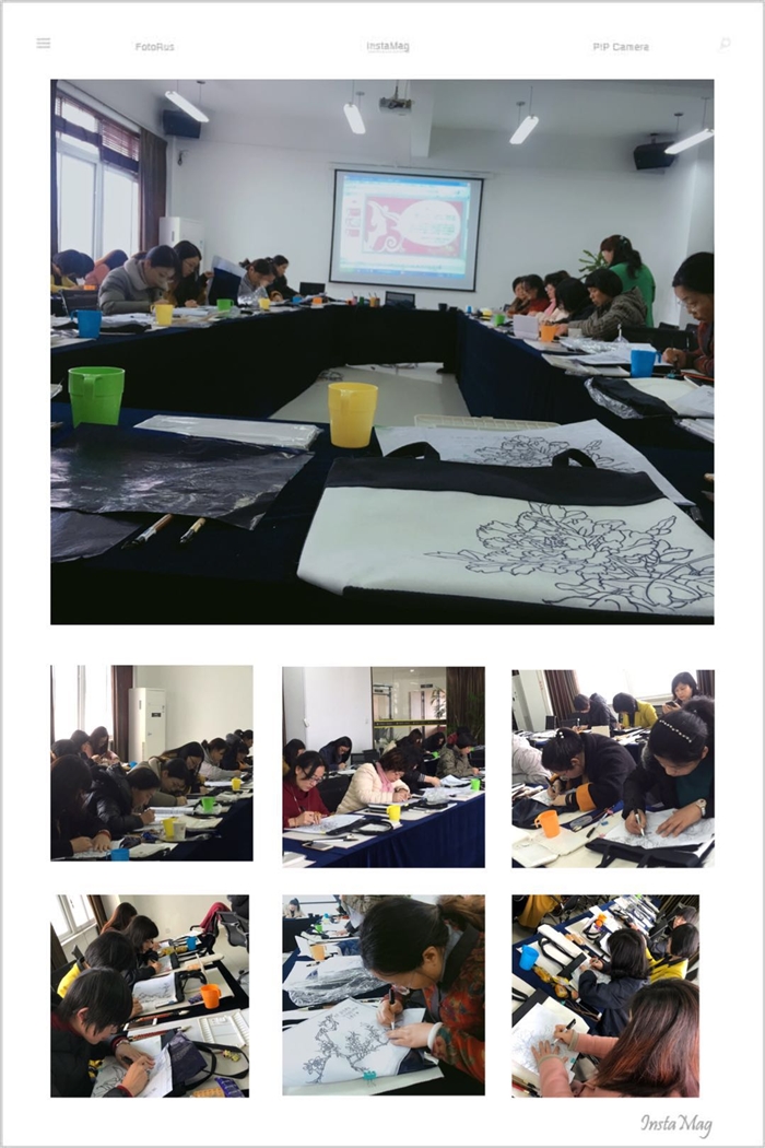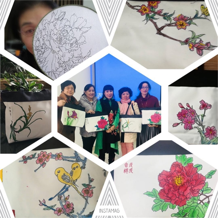 此次活动包含艺术衍生品、手绘知识介绍和亲手绘制布包两个部分,女工委早早准备了空白布包、画笔、颜料等活动材料。在戴慧的讲解下,女教职工开始定位、描绘、勾线、上色,绘制出一幅幅主题鲜明、色彩突出的中国水彩画,更是让一朵朵美丽的牡丹、百合、杜鹃、桃花跃然“包”上。