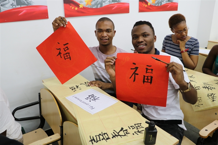 活动中,相关老师向留学生们介绍了中国汉字的起源及演变过程,并通过“看图猜字”的趣味游戏让留学生们了解和喜爱中国文字。在志愿者们的帮助下,南非留学生们开始体验书法的握笔、运笔,并很快掌握了毛笔的基本书写规范。期间,学生处处长叶吉波,副处长徐贤明对留学生们进行了一对一的指导。活动最后,每位留学生把自己最喜爱的一个汉字写在了红宣纸上并拍照留念。