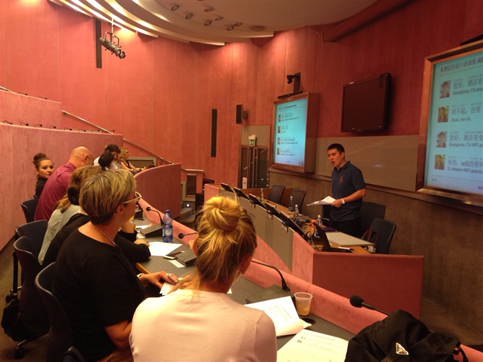 我院酒店管理专业负责人刘小方老师主讲,钟冰茹老师辅助口语训练。考虑到培训时长和实用性,培训内容以都灵旅游餐饮中接待中国游客面临的问题为主,突出实效。在4个小时培训中,进行一对一发音矫正、小组对话练习、问题反馈与解决,取得了良好的培训效果。
