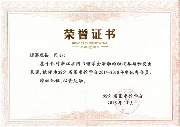 本次大会选举产生了第九届理事会理事118名、常务理事36名和新一届浙江省图书馆学会领导,并成功召开第九届理事会第一次会议。大会还对浙江省图书馆学会优秀会员和优秀学会工作者进行了表彰,我院图书馆诸葛理县老师荣获“浙江省图书馆学会2014-2018年度优秀会员”荣誉称号。