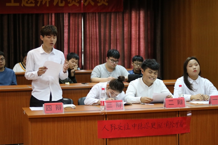 经过层层激烈的比拼,最终由中小1801班组成的“战斗起来队”与由企管1802班组成的“这是你从未面对过的全新辩论队”两支队伍脱颖而出进入决赛。两支队伍围绕辩题“人际交往中隐忍、坦率哪个更能消除矛盾”展开了激烈的对决,角逐最后的冠军。正反双方辩手就己方观点进行精彩的陈词立论。在自由答辩环节中,正反方毫不相让,双方妙语连珠,赢得阵阵喝彩,把辩论赛推向高潮。最后,经现场评委打分评定,由中小1801班组成的“战斗起来队”赢得本次辩论赛的冠军。