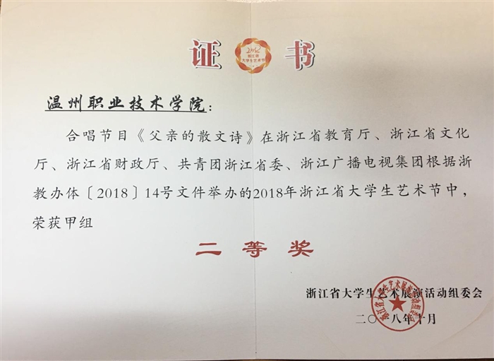 (团委通讯员 吴剑)由浙江省教育厅、浙江省文化厅、浙江省财政厅、共青团浙江省委、浙江广播电视集团主办的2018年浙江省大学生艺术节于2018年10月圆满落下帷幕。我院学生推荐作品荣获声乐类节目甲组二等奖,两名学生获“校园优秀歌手奖”。