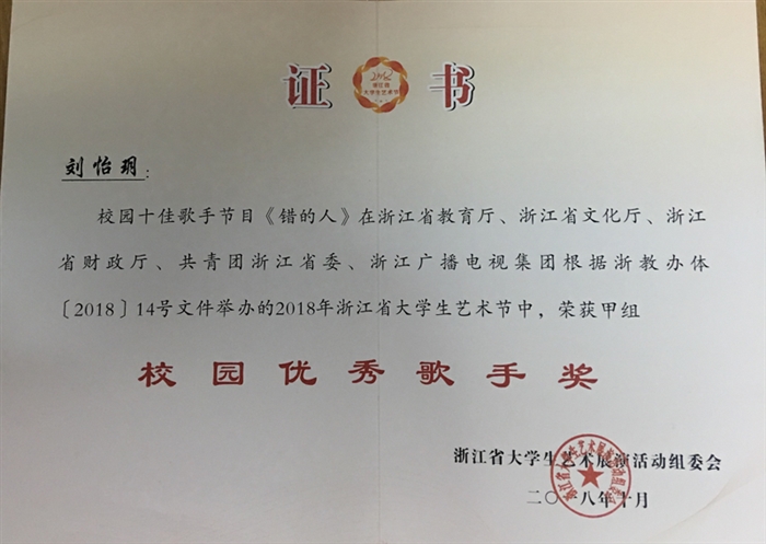 在此次大学生艺术节上,由我院大学生艺术团选送的合唱作品《父亲的散文诗》荣获浙江省大学生艺术节声乐类节目甲组二等奖;夏瑞宏和刘怡玥两位同学,分别以拿手作品《乌兰巴托的夜》和《错的人》,荣获浙江省大学生艺术节甲组“校园优秀歌手奖”。