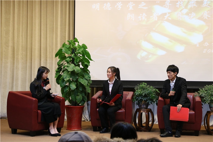 大赛围绕“青春”、“勇气”、“陪伴”和“家”四大旋律展开,20名参赛选手把文学内容与自己的生活相关联,将内心深入的情感注入文字之中,通过最纯粹的方式传播声音,为在座的师生呈现了一场听觉上的饕餮盛宴。传播1701潘芮朗读的《爱情的餐桌》、电子1702林欣滢朗读的《百合花开》、企管1801陈飞雪朗读的《给我的孩子》、电商1801宣宇加朗读的《翡冷翠的一夜》等作品声情并茂,感动全场,获得现场观众的一致好评。陈飞雪凭借较高的现场专家评分和高居榜首的微信投票得分,荣膺朗读者大赛第一名。