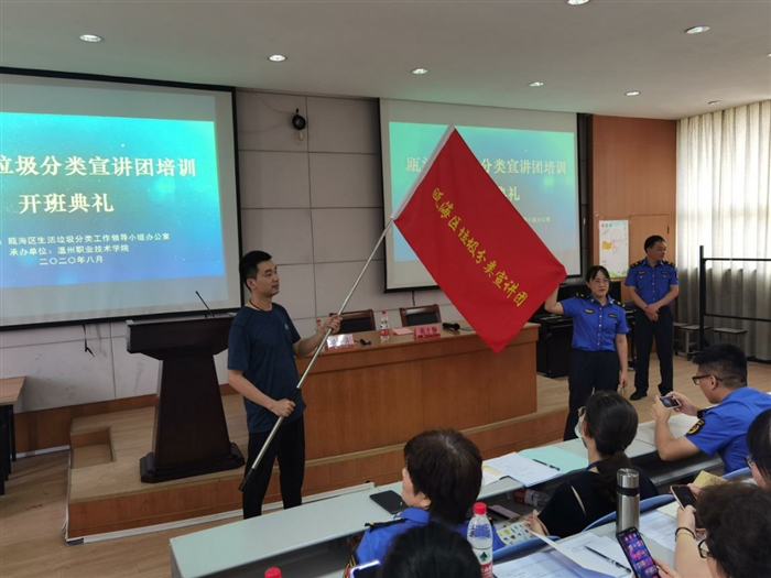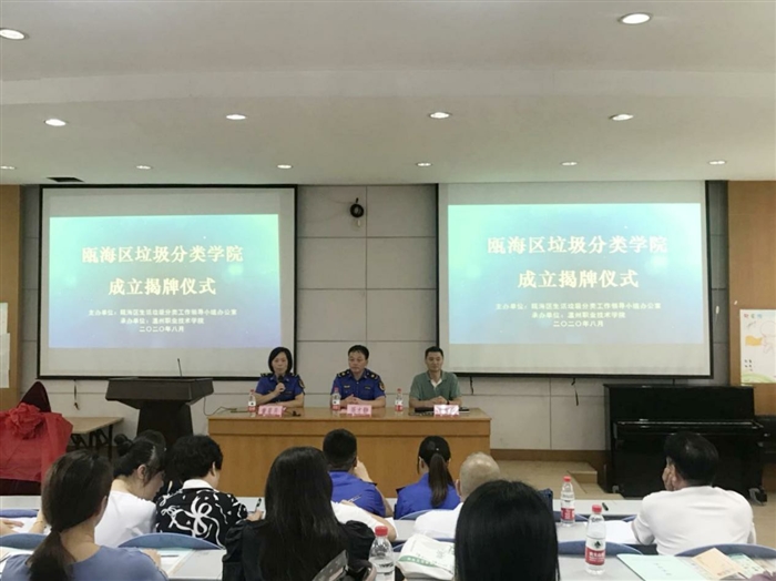 蒋家桥校区负责人叶吉波致欢迎辞,希望通过双方紧密合作,充分发挥垃圾分类学院在人员培训、课题研究、社会实践、教育宣讲、技术研发等方面的优势,不断提升垃圾分类水平和实效。瓯海区综合行政执法局局长周才静在开班典礼上作了动员讲话,他指出要充分挥学院在垃圾分类中的作用,进一步推广普及瓯海区垃圾分类工作。
