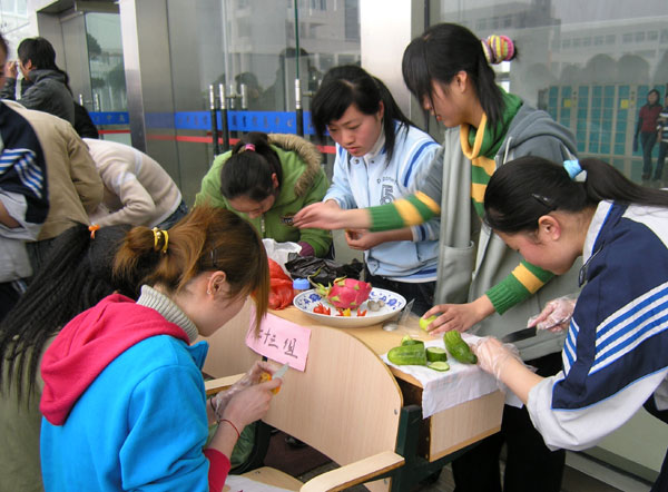 3月16日上午,由财会系团学组织主办的“水果拼盘”现场制作大赛在学院图书馆大厅前举行。本次比赛由财会系各班派队组成26支代表队,参赛选手近百人。