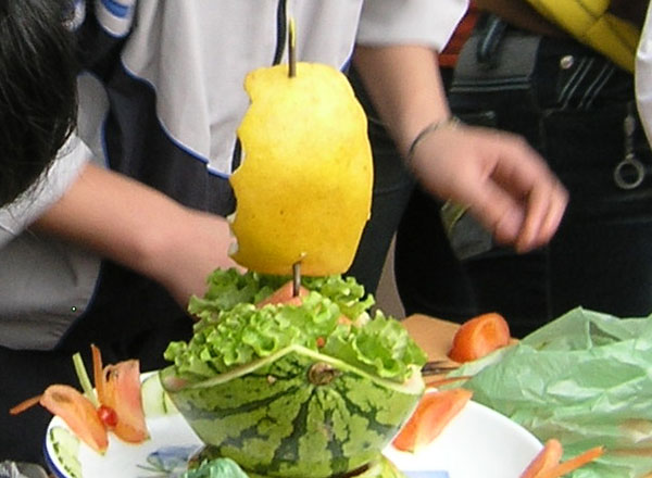 比赛帷幕一拉开,选手们开始“操刀舞剑”,事先准备好的各种水果——香蕉、苹果、菠萝、西红柿、橘子、葡萄,一并成了“砧板之肉”,比赛现场五彩斑斓,好不热闹。选手们精心雕琢着手中的水果,亲友团热情的出谋划策。不到二十分钟, 红色的“番茄兔”,绿色的“菠萝水桶”、桔色的“橘子蝶”等一件件“艺术品”相继诞生了,栩栩如生的或让人赏心悦目,或使人产生无限遐想。选手们在着妙趣横生的水果拼盘比赛中大显身手,同时也展开了智慧的较量——比赛要求给作品要一一冠名,于是比赛现场让观众和评委领略到了“含苞待放”的欣喜、“蝶恋龙”的奇妙、“一帆风顺”的祝愿和“似水年华” 的意境。