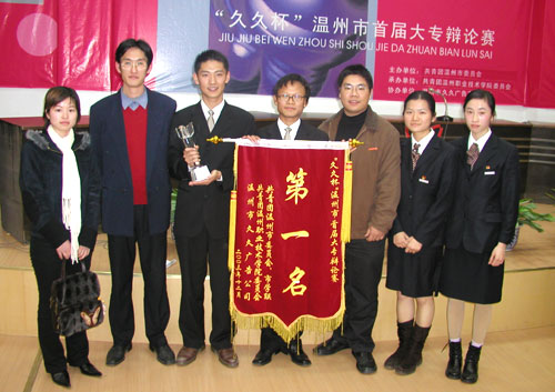 董军勇老师指导的学生在温州首届大专辩论赛中获得冠军(图左二为董军勇)