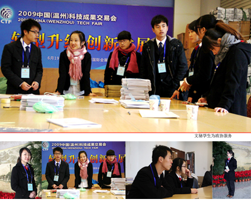 文秘专业共派出18位学生参与政协会务组、简报组、提案组的工作,他们严谨认真的工作态度,专业规范的服务礼仪和良好的专业技能,得到了政协各部门的一致好评。政协会务组陈主任说:虽然温职院每年派来的学生都是新面孔,但服务质量却始终让我们很满意。