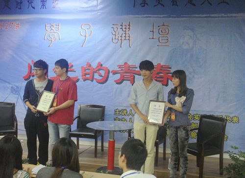 此次学子讲坛以“闪光的青春”为主题,4位社会实践优秀学生被评为学生讲师,讲述他们的社会实践经验,共同分享他们的成长与成才历程。来自温州医学院09级临床专业的郭千芊同学,讲述了她所在的“急救先锋”暑期实践队运用专业知识走访社区、普及急救知识与医疗常识的经历;工商系“爱暖童心—关爱留守儿童”文成暑期实践队的王茜南同学,与大家分享了今年暑假他们在文成东溪乡开展关爱留守儿童主题实践的生活与经历;2009级营销专业参加顶岗实习的优秀代表吴列峰同学,向大家交流了他5个月的实习生活与心得;最后是来自10级营销专业的胡兆州同学,在今年暑假他与他的团队运用自己所学知识,举办假期培训班为中小学生辅导学习,最终取得了丰富的收获。