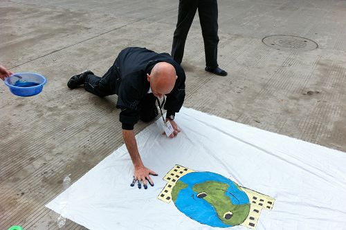 志愿者还特意准备了画有地球的宣传布,让同学们以印手印的方式,留下自己的手印,来表示对环保的宣誓。众多同学纷纷在宣传布上留下了自己誓言的手印,我院人文系的外教老师,也参与了此次活动,不仅为“摩天大楼”熄了一盏灯,还郑重的在宣传布上按下自己的手印,留下了自己对环保的承诺。