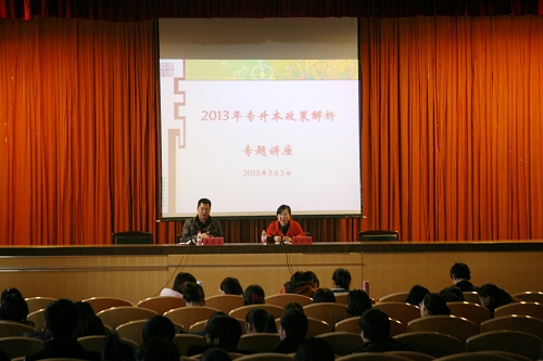 3月5日中午,2013年专升本政策解析专题会议在信息楼学术报告厅召开。招生就业处副处长金建孟、教务处副处长金欢阳、招生就业处相关成员、各系就业辅导员以及300多名有专升本意向的毕业生参加了本次会议。会议由招生就业处副处长金建孟主持。