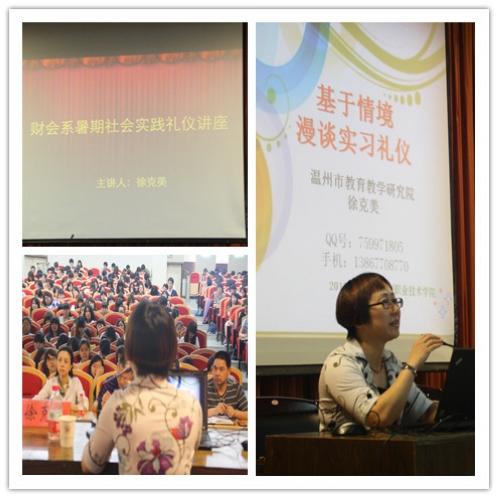 为了提高大学生暑期社会实践工作竞争力,为暑期社会实践作好充分准备。5月20日晚6点,财会系于信息楼报告厅召开主题为大学生暑期社会实践礼仪讲座。此次讲座特邀温州市教育教学研究院徐克美老师为全体大一大二年级学生解读了当代大学生在实习实践过程中应该注意的各种礼仪。财会系主任申屠新飞、党总支书记谢肖力、副主任简家进出席了此次讲座。