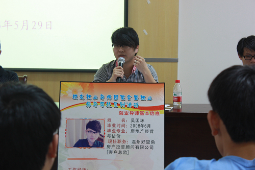 来自瑞安时代广场购物中心财务经理陈晓杰等8位校友就业导师与30多位各系在校生代表欢聚一堂。现场提问踊跃,回答精彩,掌声不断。通过对话的形式,8位就业导师就在校生代表提出的各类问题进行详细解答:如企业如何看待求职简历?面试要注意哪些问题?社团工作和学习如何调节?创业最困难的事情以及如何快速适应企业生活等问题。8位就业导师结合自身的实际工作经验和职场经历作了互动交流,与在校生代表分享了自己在就业、创业过程中经验与建议。在校生代表均表示受益匪浅、深受启发,希望学院和系部今后要多举办类似的咨询活动。