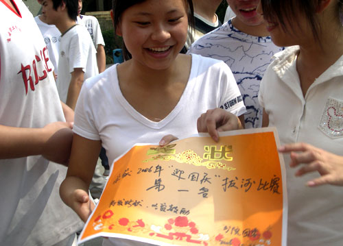 为了庆祝2006年国庆节,进一步加强学生爱国主义和集体主义教育,激发学生的爱国热情和团结互助、拼搏向上的精神,分院团委于国庆节前后举办了迎国庆“凝聚杯”系列文体活动。本次活动共设:班级拔河比赛、集体跳绳比赛、主题黑板报比赛、歌颂祖国演讲比赛等项目。