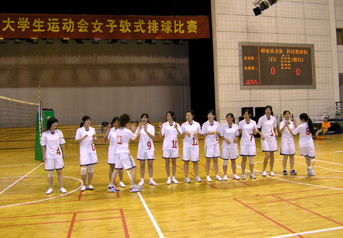 日前,温州市首届大学生运动会女子软式排球比赛在温州医学院拉开战幕,我院与温州医学院、温州大学、浙江工贸职业技术学院、浙江东方职业技术学院、温州科技职业学院(筹)、温州广播电视大学等七所大专院校参加了角逐。我院女排前三轮比赛,我院分别以两个2:0击败了浙江东方职业技术学院队和温州科技职业学院(筹)队。在与东道主——温州医学院队的对抗中,我院女排队员也发挥了良好的技战术水平,比分一直咬得很紧,最后23:25,22:25惜败。我院目前三战两胜一负,位居并列第二位。