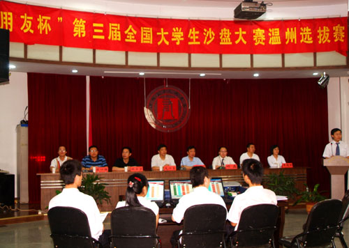 6月2日—3日,由用友软件公司主办的第三届“用友杯”全国大学生ERP对抗赛温州区选拔赛暨第一届“用友杯” 温州大学生企业模拟经营(ERP)沙盘对抗赛于在我院多功能厅举行。温州大学城市学院、浙江工贸职业技术学院、浙江东方职业技术学院以及我院等八支代表队参加了此次大赛。最后温州大学城市学院凭借强大的实力,夺走冠军,并取得代表温州参加第三届“用友杯”全国高校企业模拟经营沙盘对抗赛浙江省半决赛的资格。