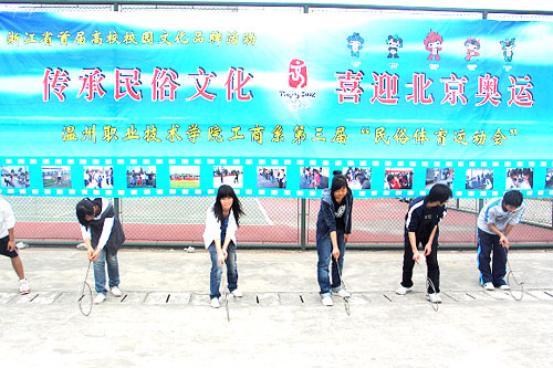 据悉,滚铁环运动是我院工商系以“传承民族文化,激扬奥运精神”为主题的民俗运动会的项目之一。该系的民俗体育运动会已经连续在校园中举办了三年,许多几乎已经“绝迹”的民俗运动项目重返校园,如丢沙包、坐人椅、跳皮筋、角斗士等。“奥运点燃了很多人的运动激情,我们在奥运来临之际在校园中开办民俗运动会,也是为了让大学生们用简单、新鲜的运动来快乐地迎奥运。”工商系党总支书记蔡后界说出了心里话。