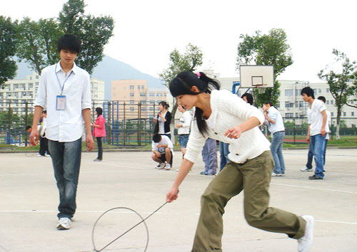 “滚铁环可以展示一个人控制一架简单机械的能力。铁环向前滚动,人在后面推动着它,它的运动被人所操纵。人既是动力,也是舵手,人就成了一个铁环的灵魂。”把这项项目引到大学校园中的工商系辅导员林香港老师兴奋地说,“滚铁环带来的快乐,高于单纯的奔跑。铁环的滚动,则好比赛车,场面火爆。场地上,大学生们大呼小叫,奔走如飞,不时地笑得旁边观众人仰马翻。”