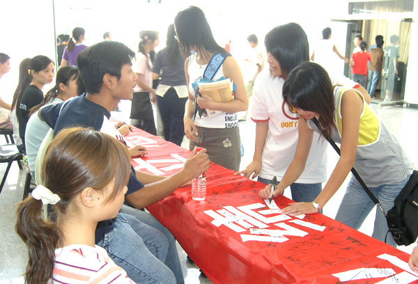 在横幅上庄重地签上自己的名字