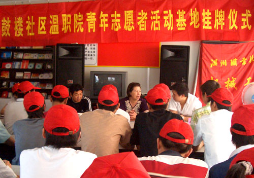 鼓楼社区党支部书记兼居委会主任林爱华与机械系辅导员梅碎彬老师,以及该系30多位青年志愿者参加了此次挂牌仪式。据了解,该基地成立后,青年志愿者们将开展社区文化科技宣传、卫生环保宣传,并参加社区的管理。志愿者们纷纷表示要积极为基地服务,不断丰富活动内容,让鼓楼社区成为“美丽温州”的一个亮丽窗口。