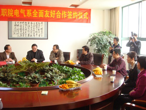 台州职院金则新院长长出席签约仪式并致欢迎词,金则新院长首先对温职院电气系陈大路主任一行的到来表示热烈的欢迎和真挚的感谢,并就台州职院办学基本情况、办学特色等作了简要介绍,肯定了双方全面友好合作的做法。徐锋主任就台职院电气系师资情况、课程开发、工学结合等发展情况向兄弟系作了详细的介绍。陈大陆主任就我院办学特色特别是示范建设以来,我系的实训基地建设、师资队伍建设、人才培养定位、校企合作自选订单式人才培养方式等作了详细介绍。双方就专业建设、课程开发、精品课程建设、实验室建设、科学研究、社会服务、信息交流等方面进行全面友好合作进行了热烈讨论。我们还参观了实验室,对台职院电气系艰苦奋斗、师生共同参与基地建设,对基地的发展思路和美好前景留下了深刻印象。