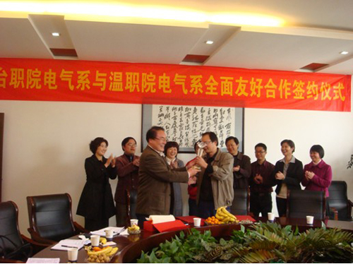 4月23日下午台职院办公楼三楼会议室,电气电子工程系与台职院电子电气工程系建立全面友好合作关系签约仪式隆重举行。我院电气系主任陈大路、党总支书记晁拥军、教研室主任、实训科长等一行六人,台州职院电气系主任徐锋、党总支副书记郑向军、教研室主任、办公室主任等参加了签约仪式。