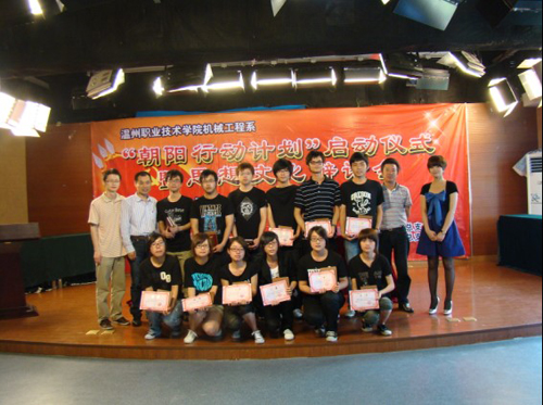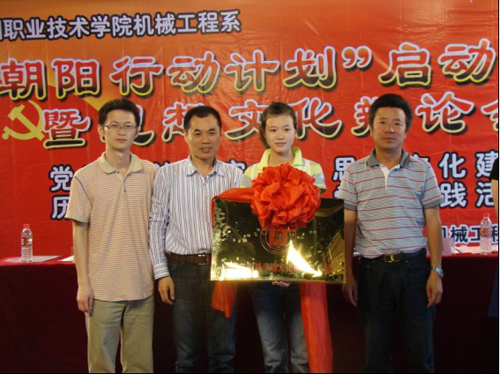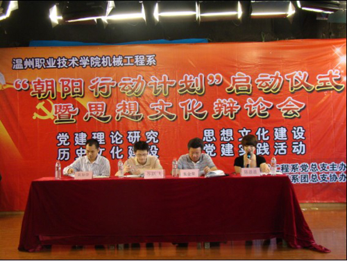2010年6月2日下午14:00,机械工程系党建创新项目——“朝阳行动计划”在一号实训楼一楼演播厅顺利启动。温职院院党委委员、宣传部朱金荣部长,学工部苏跃飞副部长应邀出席本次启动仪式。机械工程系党总支黄加銮书记、机械系学工办老师、党员教师代表、学生党员、学生干部60余人参加了启动仪式。