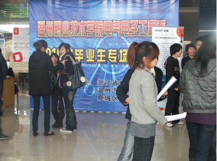 2009年12月9日下午13:30,电气系2010届毕业生专场招聘大会在信息楼大厅隆重举行。本次招聘会得到浙江省电气行业协会、温州汽摩配行业协会、鹿城区电子行业协会的大力协助,为此,招聘会吸引了正泰电器股份有限公司、德力西电气有限公司、人民电器集团、长城电器集团等43家企业前来招聘,为毕业生提供了665个就业岗位。系主任陈大路、党总支书记晁拥军、辅导员孙建华老师也前来招聘现场,与企业方热情洽谈,为毕业生解答疑难。