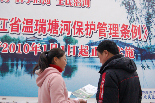 2010年1月2日,是《浙江省温瑞塘河保护管理条例》颁布实施的第二日。当天,建工系团学组织成员来到了松柏社区义务宣传保护温瑞塘河的《条例》。