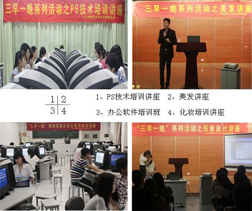 本学期,人文传播系结合开设专业特色,在晚自修期间邀请相关专业教师为学生们开展了系列讲座培训:针对文秘专业,开展了会议速录培训、办公软件培训;针对传媒专业,开展了PS技术培训、形象设计培训;针对英语专业,开展了等级考试应试技巧培训、英语角口语交流培训;诸多专业知识培训,带领学生们走进了浩瀚的知识海洋,加强了学生们的专业技能,提升了学生们的内外在素养。