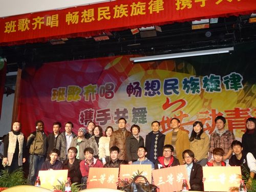 黄加銮书记为晚会致辞,对医学院及财会系老师的到场表示感谢同时希望我们的班歌齐唱活动能够越办越好。参加此次比赛的有10个新生班级,各参赛班级经过一个多月的精心排练,他们以整齐的服装,饱满的精神,嘹亮的歌声,有序的队列给在场的观众带来了精彩纷呈的视觉大宴和听觉享受,他们用歌声充分表达出了深厚的友谊,唱响了拼搏奋进的时代主旋律。比赛期间,更有特邀来宾——医学院加纳籍学生带来的温州话演唱,掀起了晚会的高潮,同时激动人心的抽奖环节,将比赛的气氛推向制高点,欢笑声一浪高过一浪。此次比赛,评出了一二三等奖及优秀奖。