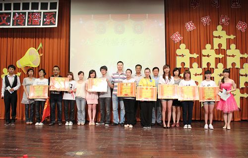 整场晚会分为三个部分:首先,系部对本学年在“三早一晚”活动中表现突出的示范班级和先进个人进行表彰;其次,各班级分别用PPT汇报的形式向观众呈现了班级在过去的一学年里所经历的精彩和辉煌;最后,各班级学生以其别出心裁的班歌形式演绎了他们对班级的热爱,展现了各自班级的风采。商英1001班和文秘1001班带来的《明天会更好》,用他们心中最真诚的声音唱出了他们对未来的美好憧憬,引起了全场观众的共鸣;文秘1002班带来的《我的舞台》充满自信地唱出了“我的舞台,我自己主宰”的雄心壮志。感人的解说和精彩的班歌,将评比晚会的现场气氛推向了高潮。经过紧张激烈地角逐,最终文秘1002班荣获本学年学习型班集体评比第一名的好成绩。