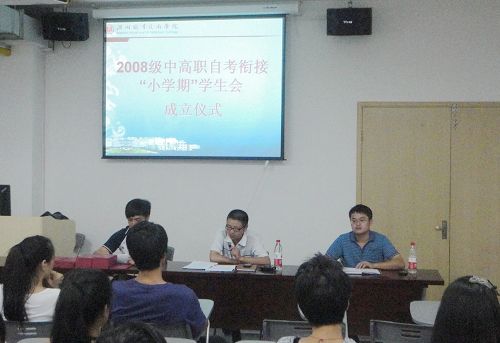 7月28日下午,成教学院在学生活动中心212会议室举行了2008级中高职自考衔接“小学期”学生会成立仪式。成教学院副院长欧阳翰夫出席了会议。会议由学工办主任刘海明主持。