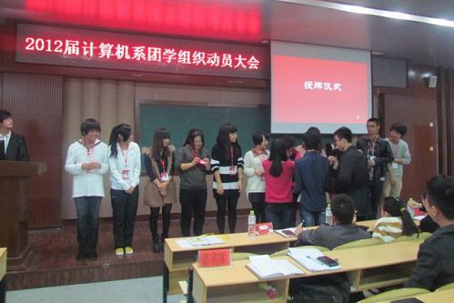 为了提高计算机系所有团学成员的凝聚力,调动大一新干事对团学组织工作的热情,计算机系于11月21日下午在2号教学楼101教室召开了2012届计算机系团学组织动员大会。 出席大会的嘉宾有罗小阳老师、徐莎老师、李文静老师、黄立强老师和2011届的团总支副书记罗永潮学长。