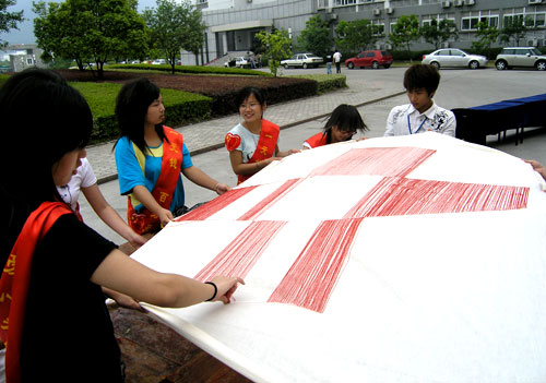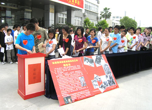 5月15日,我院200多个班级班长齐聚行政楼前举行为灾区献爱心活动。各班班长把同学们汇集的爱心款投到捐款箱。学院团委还策划组织了“共织爱心”爱心活动,学生干部们轮流在白色的布上面绣“红十字”。这一针一线织出来的“红十字”将连同同学们的善款一起送到地震灾区,以表达表达对灾区人民的关切和祝福。