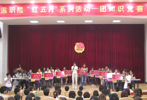 5月17日晚,我院团委在信息楼报告厅举行了温职院“红五月”系列活动——团知识竞赛。本次比赛,学院八大系各自组队参加角逐,每个队有3名选手参加,竞赛包括必答题、抢答题、风险题三类题目。题目内容对参赛选手进行了团知识的考核。经过2个小时的激烈的斗智斗勇,财会系笑到了最后,捧走了冠军。轻工学院、工商系分获二、三名。